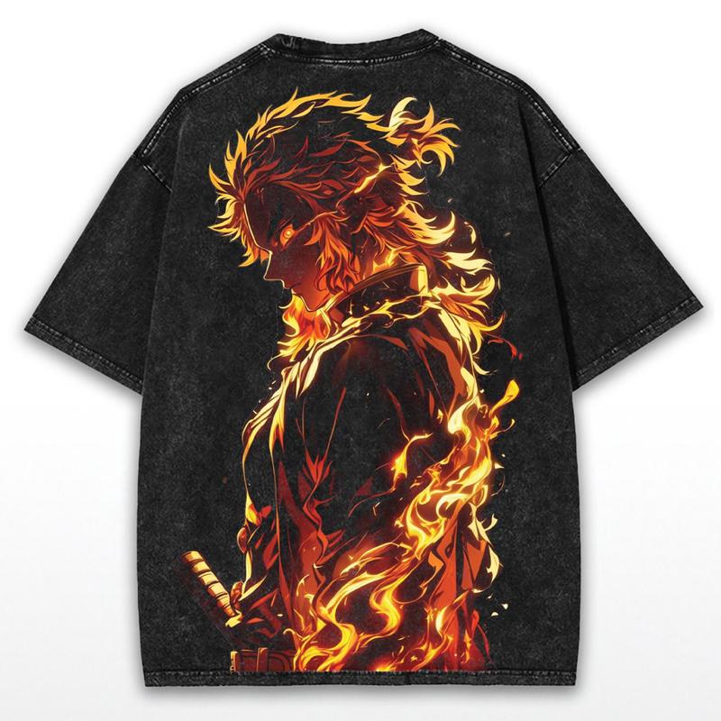 Kyojuro Rengoku Demon Slayer Oversized Washed Tee – Flame Hashira Double Printed Cotton Shirt | Only for True Anime Fans